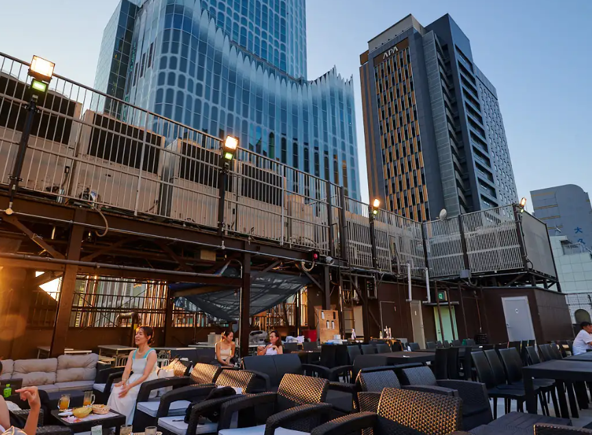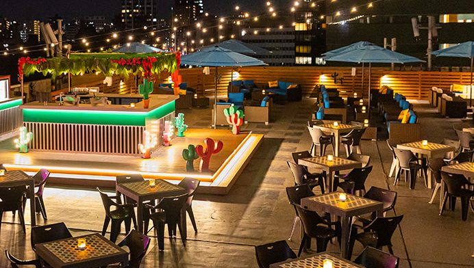 - 可動式屋根付き、BBQ食べ放題も楽しめる屋上スポット。